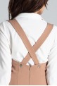 Sukienka midi bez rękawów z dopasowaną górą. Duży dekolt w szpic. Odkryte plecy. Zapinana z tyłu na kryty zamek oraz ozdobne szelki zapinane na zatrzaski. Sukienka bez kieszeni z podszewką.
