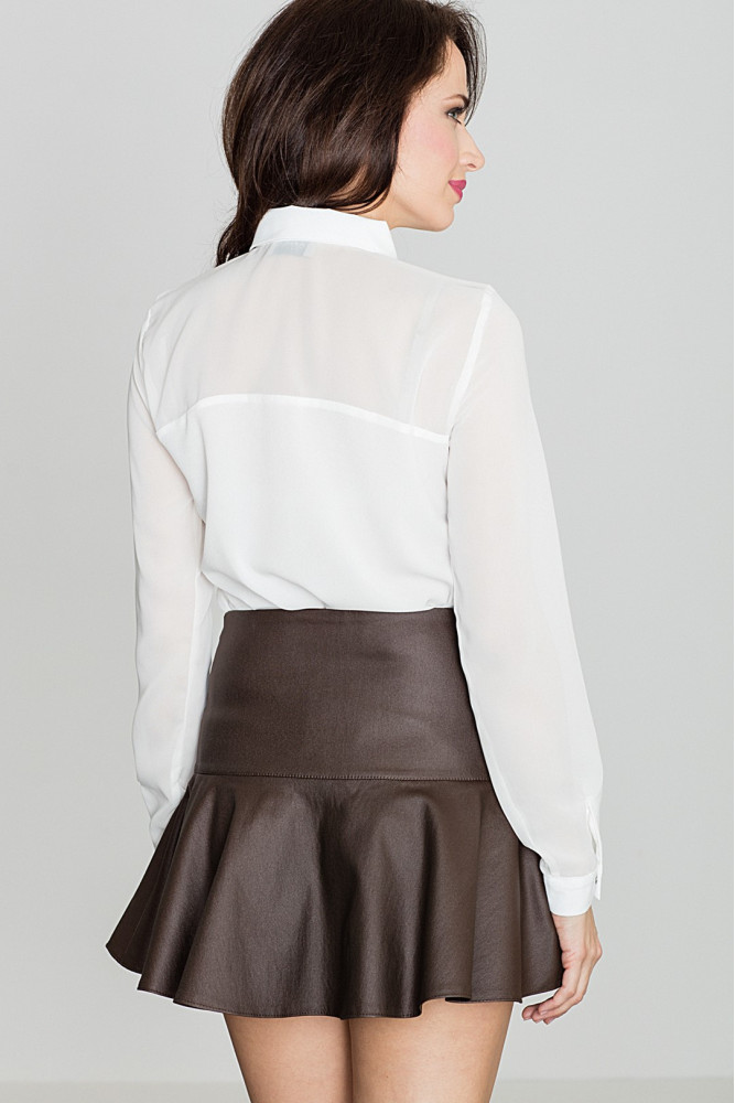 spódnica mini z lekko połyskującego materiału. Zapinana z boku na kryty zamek. Karczek gładki, dół z szeroką, rozkloszowaną falbanką. To model uniwersalny i bardzo kobiecy świetnie sprawdzi się w wielu stylizacjach.