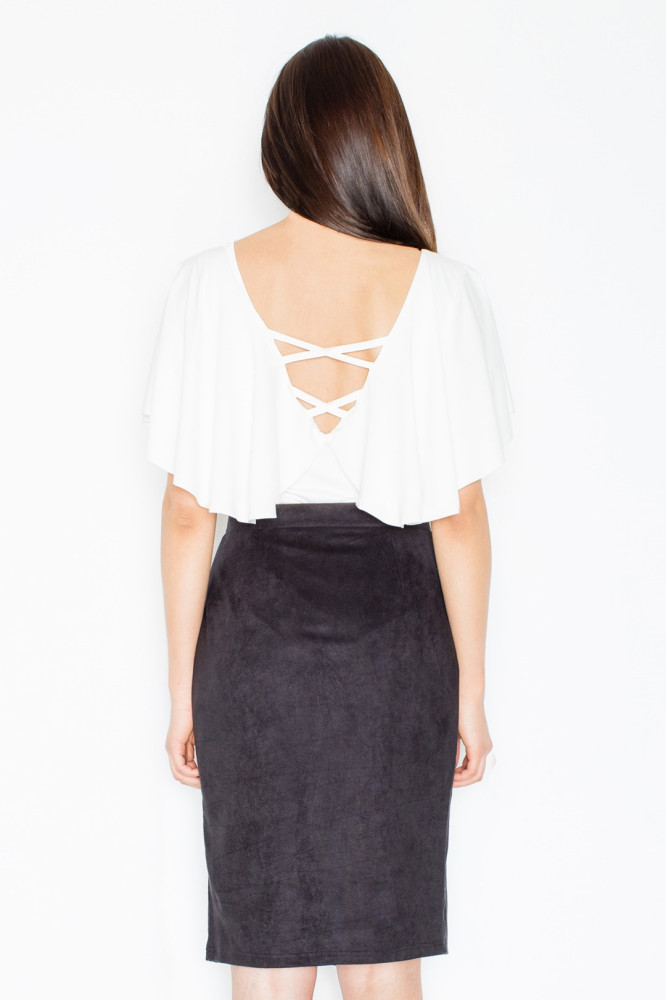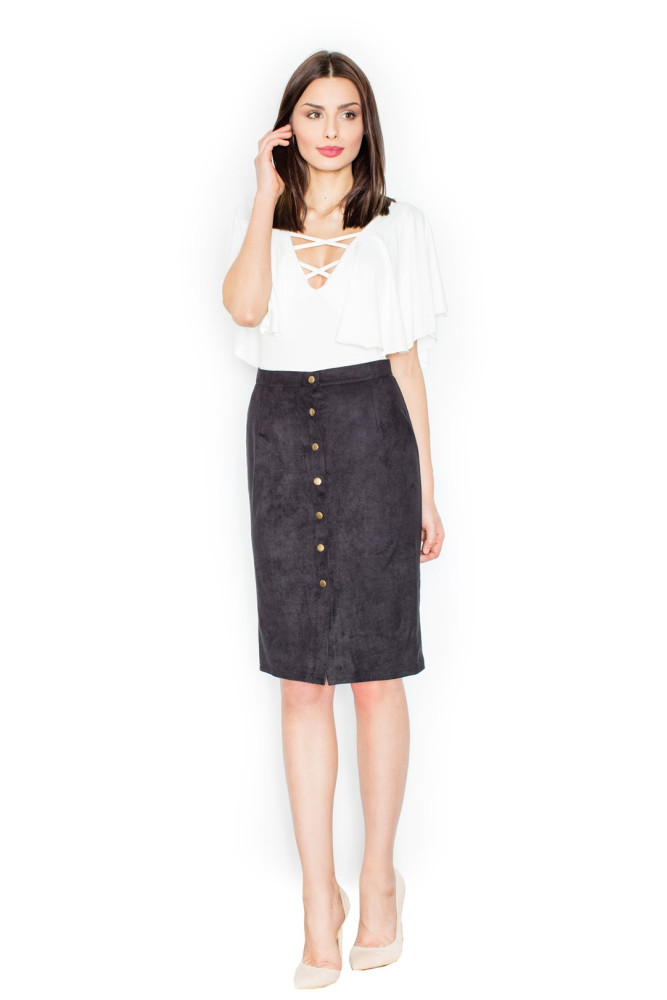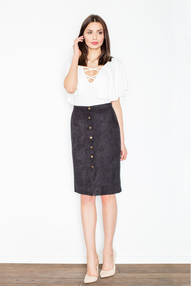Elegancka, zamszowa ołówkowa spódnica zapinana na napy. Wykonana z delikatnego materiału imitującego zamsz. Bardzo przyjemna w dotyku.